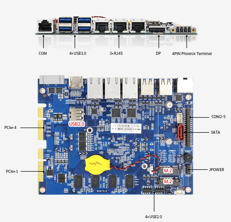 The MITX-KL20 is an embedded motherboard, supporting Intel® latest Gen. Kabylake-U Core™ i3/i5/i7 Celeron processor (BGA 1356), Celeron® 3865U, Core ™ i3-6100U, i3-7100U, Core™ i5-7200U, Core™ i5-6200U.
