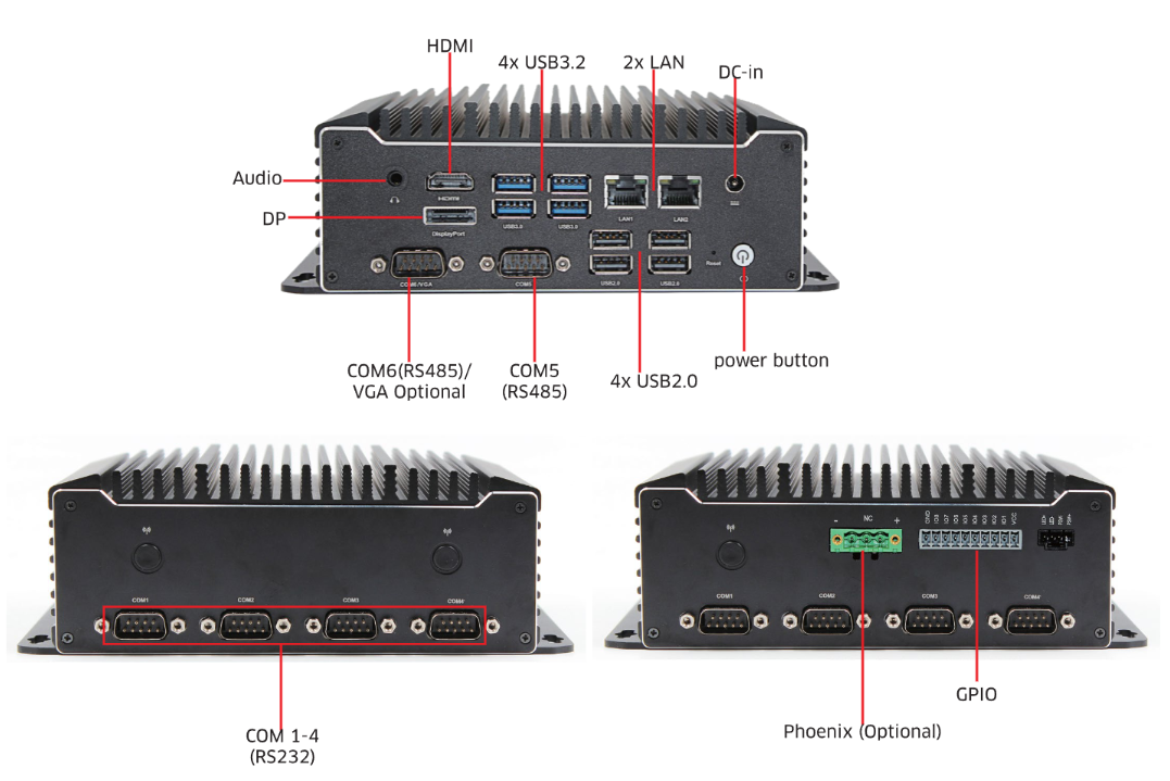 Power: 12V/19V DC input, Phoenix input optional